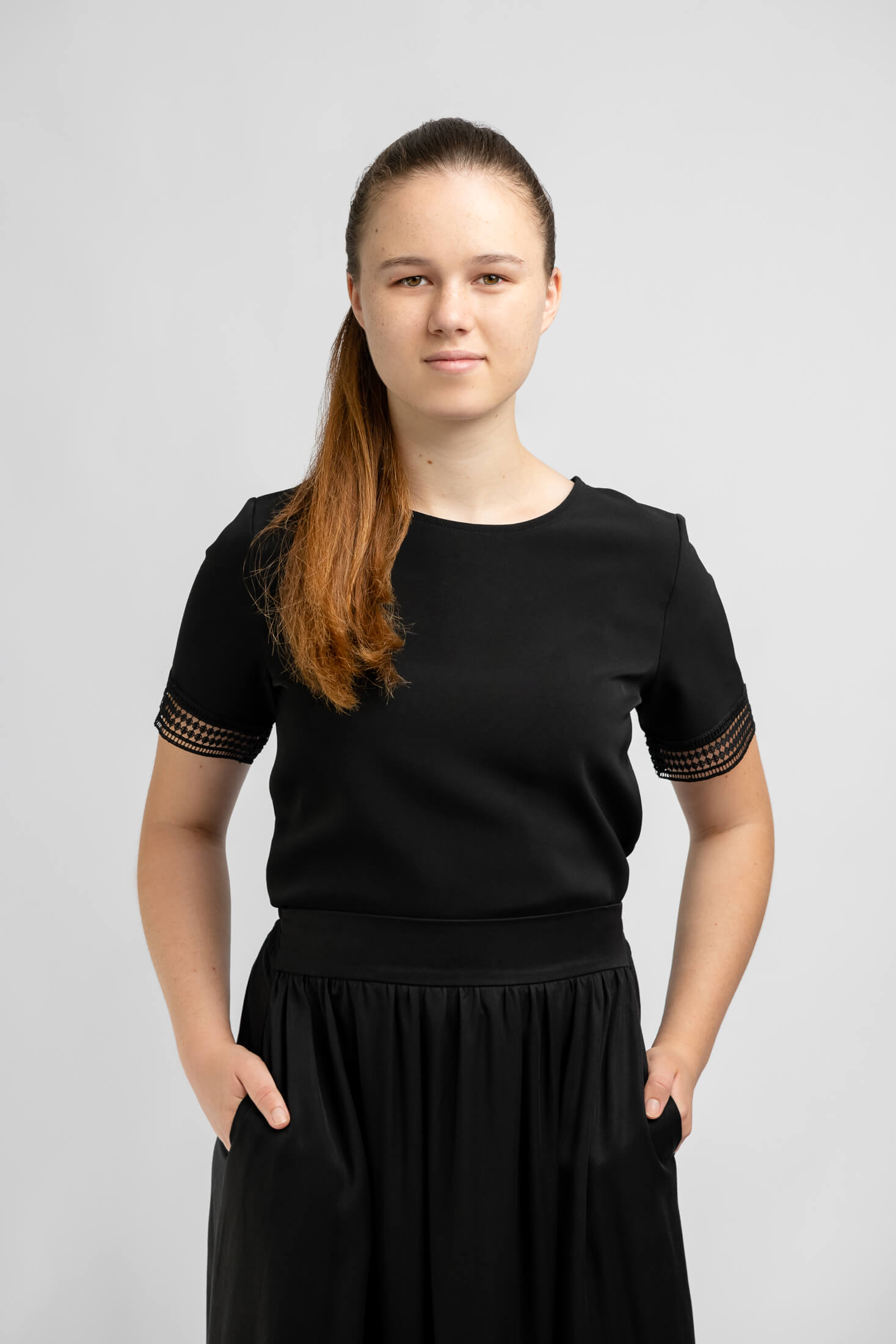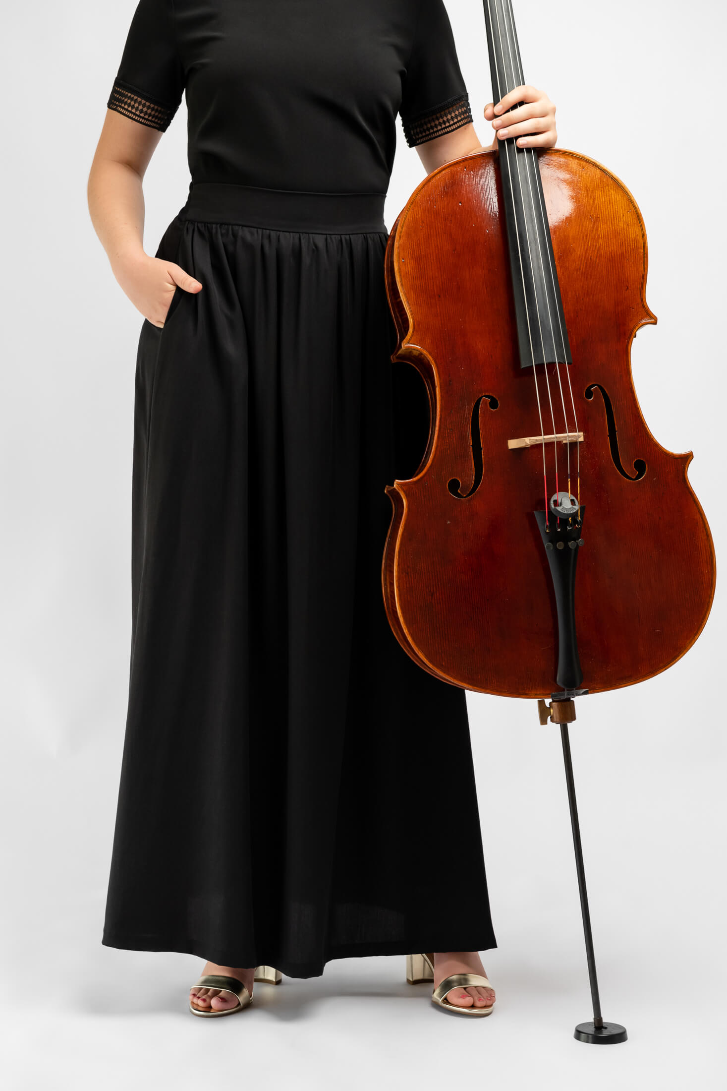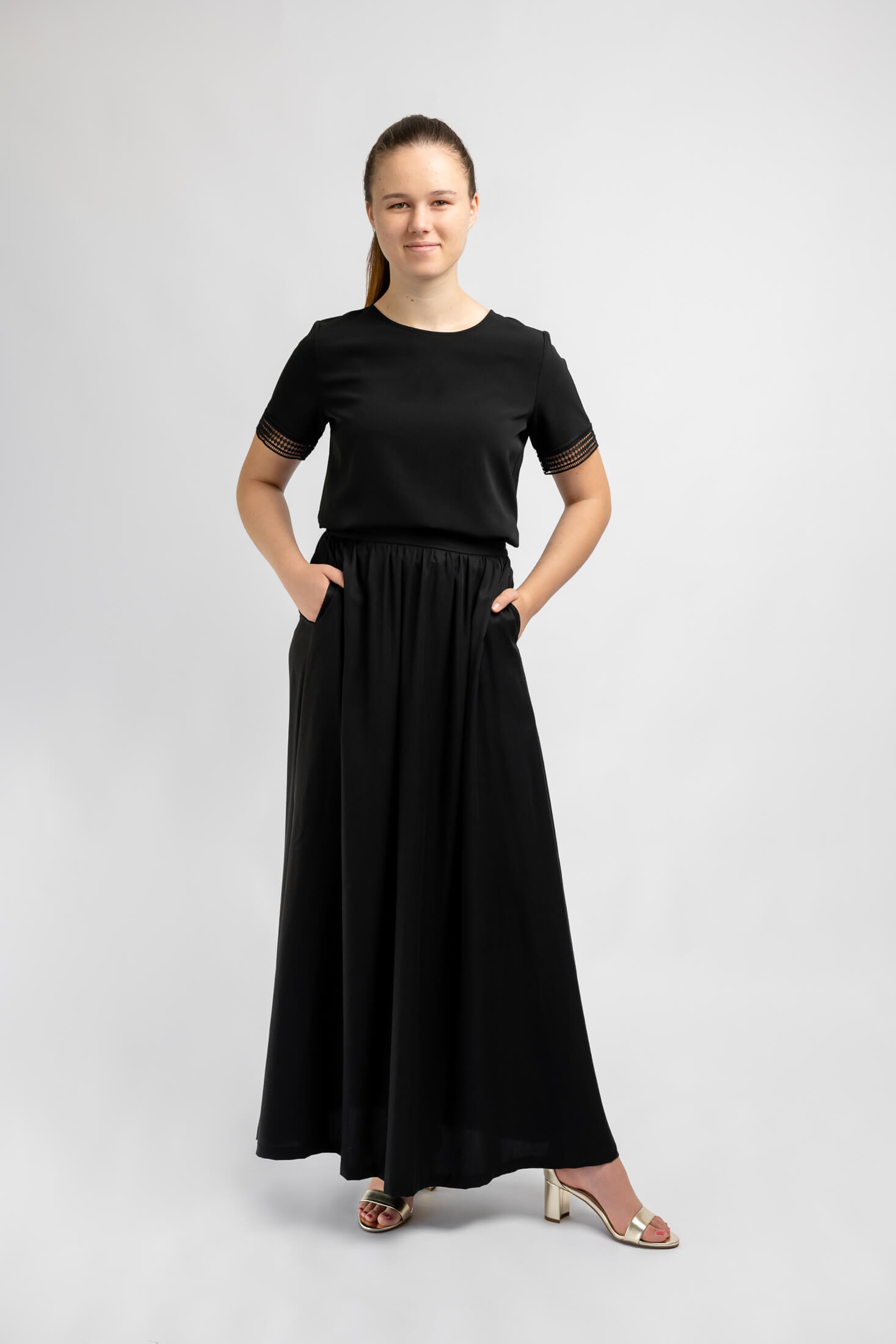 Our new long black ankle length skirt is perfect for girls in orchestra or choir. It has elegant drape, 2 functional side pockets, and a comfortable elasticated waist. It meets all concert black regulations and its simple design pairs well with our short sleeve lace blouse and long sleeve blouse.